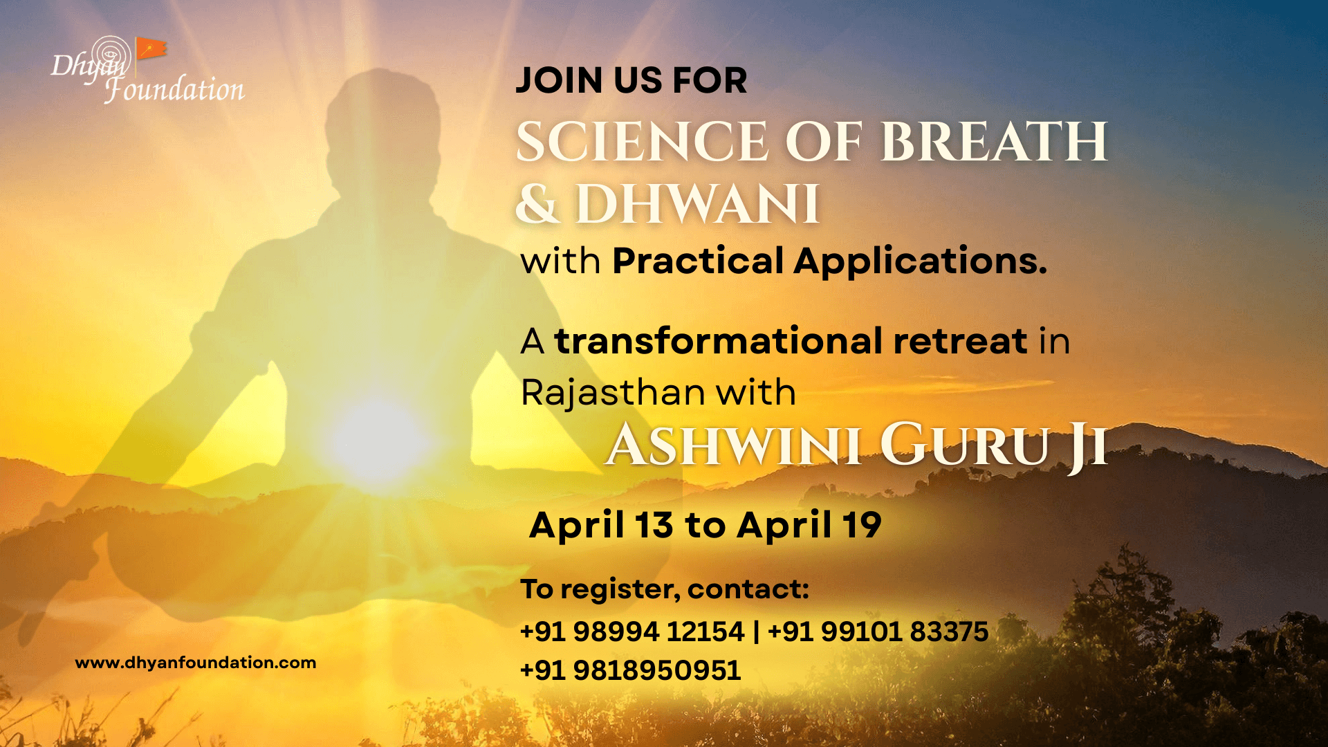 Visitors Please Note! Dhyan Foundation does not promise or claim to perform any miracles, healings or demonstrate supernatural powers to the practitioners.