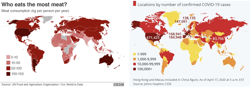 Another noteworthy exception is India, where the meat consumption is far too low but the number of infected cases is surprisingly high. At a glance, one would attribute this to the dense population of India. However, there are other densely populated areas that are not equally infected.
