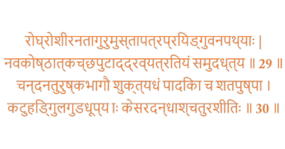Gandhayukti mentions another formula to prepare varied perfumes using a fixed number of ingredients. As per shlokas 29 and 30, mix together any 3 of the 9 substances - Lodhra (Symplocus racemosa - herb), Ušira, Nata (Indian trumpet flower tree), Agaru (Agarwood), Musta (Nut grass), Malaya (Sandalwood), Priyangu (creeper), Dhana (coriander) and Pattya. Add to the mixture 1 part of sandalwood, 1 part of Turushka (seeds of Hyoscyamus niger Linn), 1/2 part of Nakha (a nail like sea product) and 1/4 part of Satapushpa (dill plant) and expose this mixture to the smoke of Katuka (herb also known as Kutki), Hingula (mineral ore of mercury) and Guda (jaggery). Thus 84 different varieties of mixtures can be obtained from these 9 ingredients.
